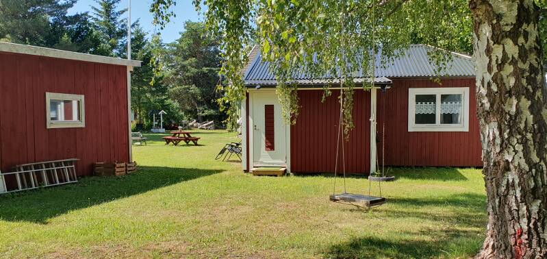 Område bredvid semesterhuset med gungor och studsmatta