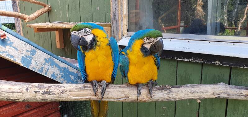 Våra hårt arbetande höns ger färska ägg och papegojorna blir glada när någon är upptagen med dem.