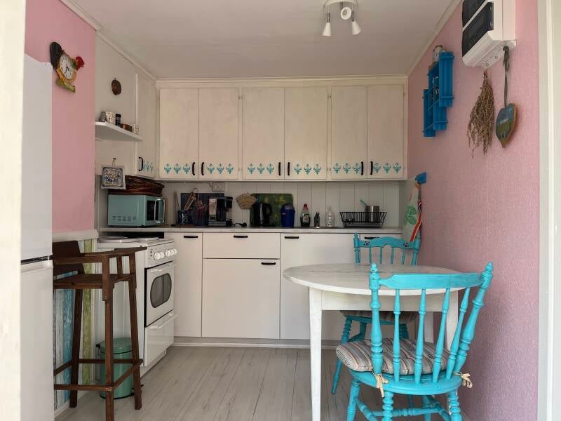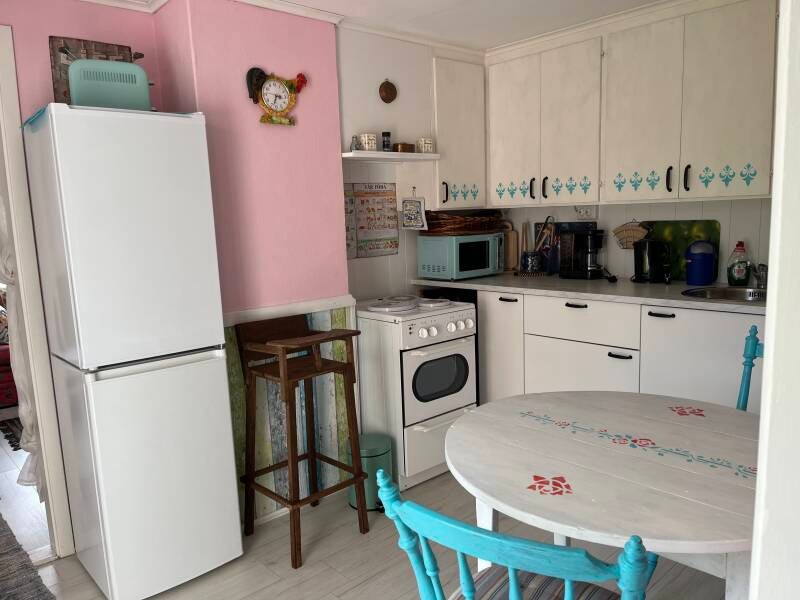 Kök med kyl och frys, spis, mikrovågsugn, kaffebryggare, brödrost och all disk